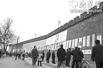 荊楚網(wǎng)(楚天都市報)(記者釋喻 攝)前日上午,襄樊西門橋古城墻上舉辦了一場別開生面的書法展,近百幅作品被懸掛在城墻上,向市民免費展出,展覽為期7天。此次活動由襄樊市文聯(lián)等單位舉辦,展出的是書法家王樹人先生的遺作和其傳人的近期作品;顒蝇F(xiàn)場還進(jìn)行了書法義賣,所得款項將用于襄樊歷史文化名城的保護和宣傳工作。
