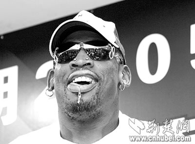 七分鐘后,前NBA巨星羅德曼出現(xiàn)在人們的視野里。他顯得有些疲倦,白色球帽遮住了那大半個五顏六色的后腦勺,不過那張有些冷酷的臉,還是讓人很快認(rèn)出,這就是那個我行我素的“大蟲”羅德曼。