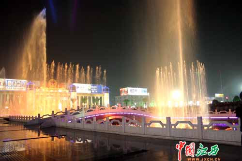 百米長的音樂噴泉伴隨著《中國人民解放軍進(jìn)行曲》、《走進(jìn)新時代》等雄壯的樂曲翩翩起舞