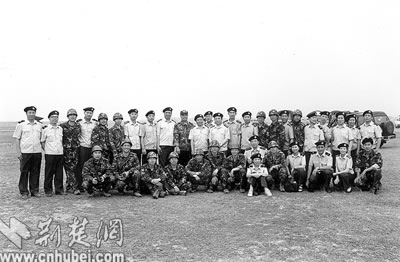 我國(guó)首批宇航員在駐鄂空降兵某部圓滿完成傘訓(xùn)任務(wù)后,與部分傘訓(xùn)保障人員合影。前排左二為聶海勝,后排右六為費(fèi)俊龍,后排左六為楊利偉。