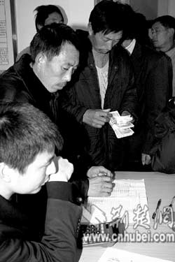 荊門麻城鎮(zhèn)譚珍國(guó)等農(nóng)民工,在天門市勞動(dòng)保障監(jiān)察大隊(duì)領(lǐng)取用人單位所欠的工資款(上圖)。去年12月以來,天門市組織有關(guān)職能部門對(duì)全市37家用人單位支付農(nóng)民工工資情況進(jìn)行專項(xiàng)檢查,共查出6家用人單位拖欠農(nóng)民工工資,他們及時(shí)為2056名農(nóng)民工追回工資180余萬元(下圖)。(特約記者肖金舫通訊員劉銀斌攝)