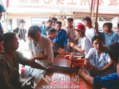 15日,參加武鋼工程建設(shè)的百余位農(nóng)民工兄弟,樂呵呵地接受了中國一冶電裝公司武鋼項目部為他們免費進(jìn)行的體檢。浠水工程隊民工朱宗杰說:“這兩年來,社會各界對農(nóng)民工的關(guān)心很實在!