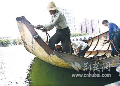 “船太大了,沒辦法運出城,只好進(jìn)行分解后運走!必(fù)責(zé)現(xiàn)場施工的馬先生解釋,2002年初,他所在的公司承攬東湖清淤工程,共運來8條清淤船,其中一條船放置在水果湖。當(dāng)時,經(jīng)有關(guān)部門批準(zhǔn),這些船由大型車輛運來并吊入湖中。目前清淤工程結(jié)束,湖中的船不好運走,只好割成一塊塊鋼板,當(dāng)成廢鋼賣掉。