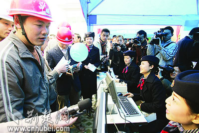 像譚梅一樣,昨天共有300多名農(nóng)民工涌到武漢市總工會(huì)大院,參加了在這里舉行的武漢市農(nóng)民工“平安返鄉(xiāng)”票務(wù)趕集會(huì)。在武漢市總工會(huì)組織下,漢口火車站、傅家坡長(zhǎng)途汽車站、武漢港務(wù)集團(tuán)客運(yùn)站等7家客運(yùn)單位,紛紛來到趕集會(huì)現(xiàn)場(chǎng),為農(nóng)民工提供熱情的票務(wù)服務(wù)。