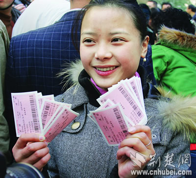 昨天上午9時(shí)許,在武漢某勞務(wù)公司工作的四川打工妹譚梅,攥著剛剛打印出來的一沓火車票,眉開眼笑:她和她的同事們,今年春節(jié)回家不用再擔(dān)心車票了!