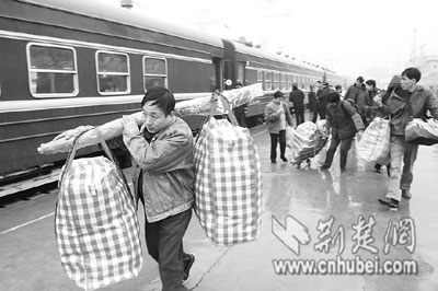 ?10分鐘后,這趟民工專(zhuān)列駛離武昌站,于昨晚20時(shí)20分到達(dá)襄樊。據(jù)武昌站介紹,節(jié)前的民工專(zhuān)列多從南方發(fā)往武漢,節(jié)后武漢鐵路局將加開(kāi)大量南下、東進(jìn)的民工專(zhuān)列。
