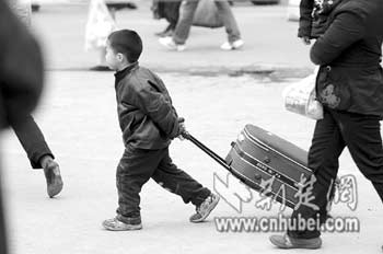 昨日,武昌火車站進(jìn)站口,快樂的小方樾幫大人拖著行李箱(上圖)。