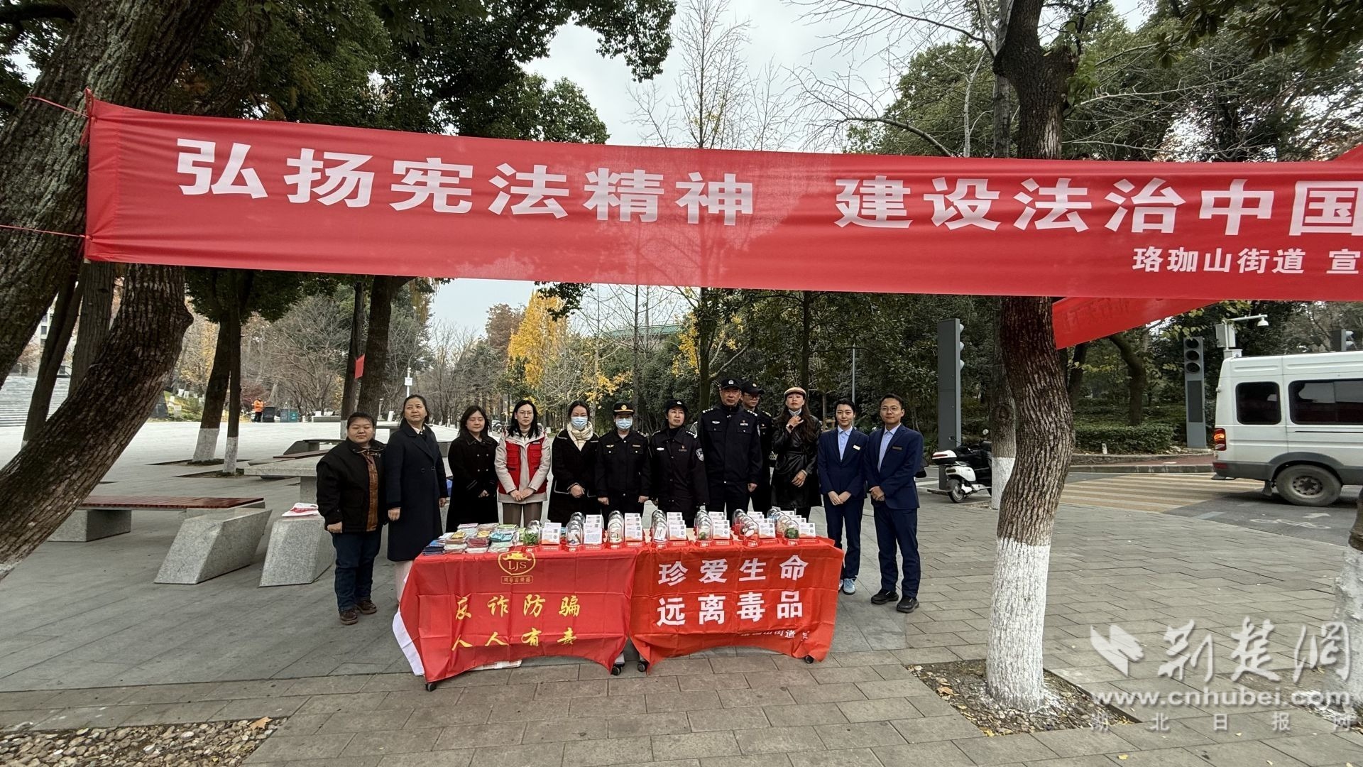 荊楚網(wǎng)(湖北日報(bào)網(wǎng))訊(通訊員 方茜)12月4日,武昌區(qū)珞珈山街道聯(lián)合武漢大學(xué)保衛(wèi)部、轄區(qū)派出所、司法所、執(zhí)法隊(duì)等多部門,在武漢大學(xué)萬林藝術(shù)博物館門前舉辦“憲法宣傳周”暨國家憲法日集中宣傳活動。本次活動以“憲法守護(hù)健康權(quán),禁毒筑牢生命線”為主題,旨在弘揚(yáng)憲法精神,增強(qiáng)全民法治觀念,同時(shí)深化禁毒宣傳教育,筑牢校園與社會禁毒防線。