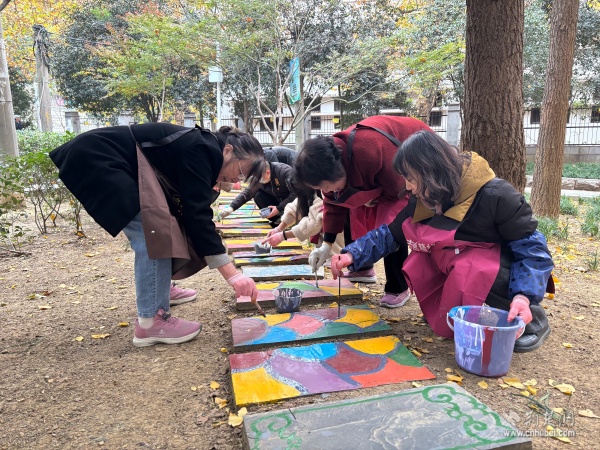 30余名黨員與社區(qū)居民攜手執(zhí)筆,在社區(qū)能人的指導(dǎo)下,依據(jù)設(shè)計圖稿細(xì)心勾勒線條,精心調(diào)配赭石、石青、石綠等傳統(tǒng)礦物色彩,悉心填充花瓣、枝葉。草坪里原本素樸的地磚漸漸綻放出繽紛圖景:象征革命精神的紅色印記、勾勒武昌古城風(fēng)貌的文化符號,以及依循“十二花令”鋪陳的水仙、桃花、菊花等時令花卉與梅蘭竹菊的清雅風(fēng)骨藝術(shù)化呈現(xiàn)。