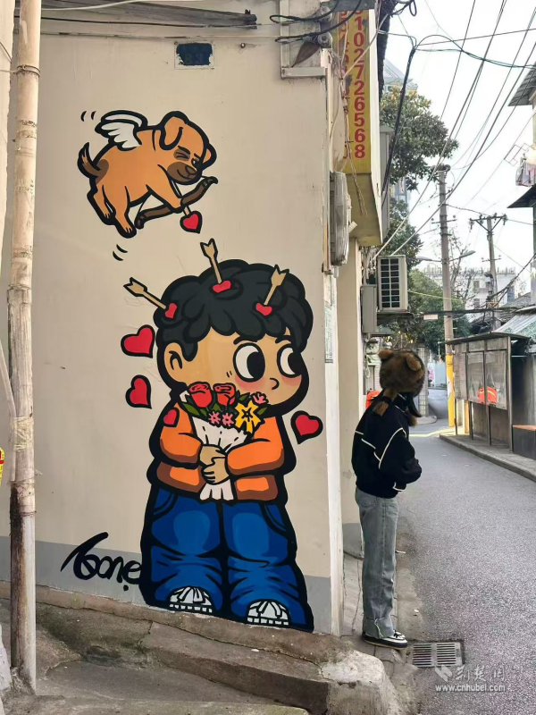 經(jīng)過藝術(shù)團(tuán)隊改造,一幅幅創(chuàng)意彩繪在老墻上生動綻放:俏皮的丘比特小狗對藏身墻角手捧鮮花的小男孩發(fā)射愛心之箭,靈動的貓咪順著管道輕盈攀爬,街邊常見的管道被巧妙繪成卡通小車的排氣管……這些充滿巧思的設(shè)計,讓原本陳舊單調(diào)的墻面變成了居民家門口的“露天畫廊”,也為老街增添了別樣的生機與溫度。