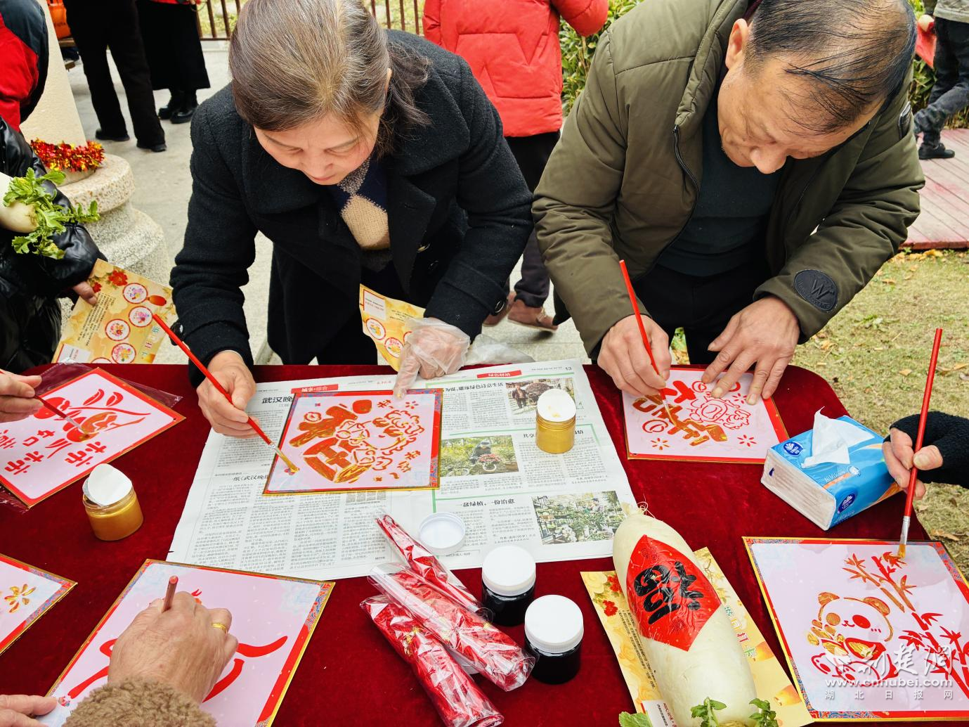 手工體驗(yàn)區(qū)則充滿了濃厚的文化韻味,大家在志愿者的指導(dǎo)下,將雕刻著不同書體“?!弊峙c馬年吉祥紋樣的模板,小心翼翼拓印在紅色宣紙上。當(dāng)一幅幅帶著墨香的福字躍然紙上,不僅定格了傳統(tǒng)技藝的獨(dú)特魅力,更承載著大家對新年福氣盈門的美好期盼。“我拓了一個‘?!郑蛩銕Щ丶屹N在門上,希望新的一年全家都福氣滿滿!”一位年輕媽媽舉著自己的作品,開心地分享道。