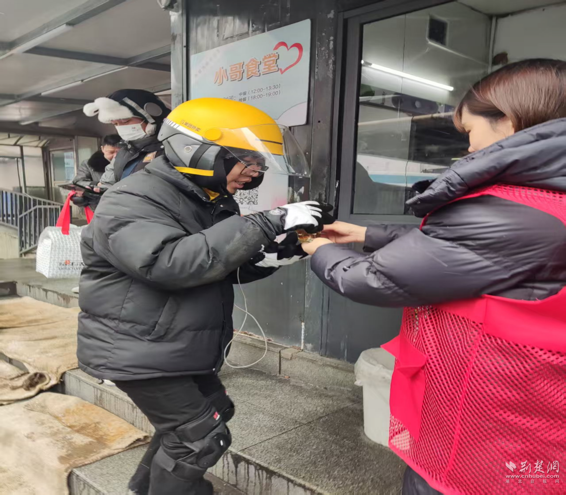 寒潮來臨前后,江漢區(qū)各街道依托江城驛站、愛心商戶和“小哥食堂”等服務陣地,迅速將取暖、飲水、熱食等保障送到一線。