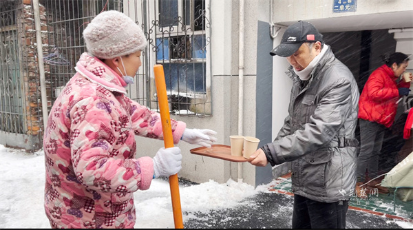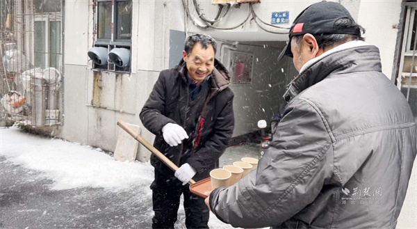 “大家歇一歇,喝點(diǎn)姜茶暖暖身子!”正當(dāng)眾人干勁十足時(shí),一位黨員居民端著熱氣騰騰的姜茶走來,將暖茶遞到每個(gè)人手中。“我家老伴重癥需要照顧,沒辦法和大家一起出力,只能煮點(diǎn)熱茶讓大家暖和一下?!币槐琛⒁宦晢柡?,凝聚起鄰里間最真摯的情誼,為掃雪行動(dòng)更添溫情。