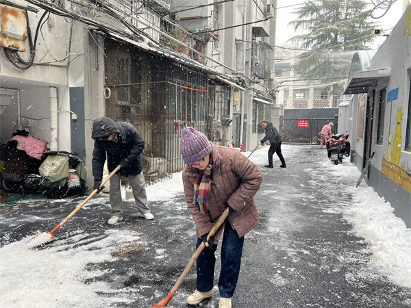 一大早,三名居民志愿者便率先行動(dòng),有人清掃路面浮雪,有人揮舞鐵鍬鏟除薄冰,還有人主動(dòng)疏導(dǎo)過往居民,提醒大家小心路滑。在志愿者的帶動(dòng)下,越來越多居民走出家門加入掃雪隊(duì)伍,原本寂靜的小院變得熱鬧起來,歡聲笑語驅(qū)散了冬日寒意,鄰里距離也在并肩勞動(dòng)中悄然拉近。社區(qū)工作人員帶著掃雪工具趕來時(shí),正撞見熱火朝天的勞動(dòng)場景,隨即也加入掃雪行列。