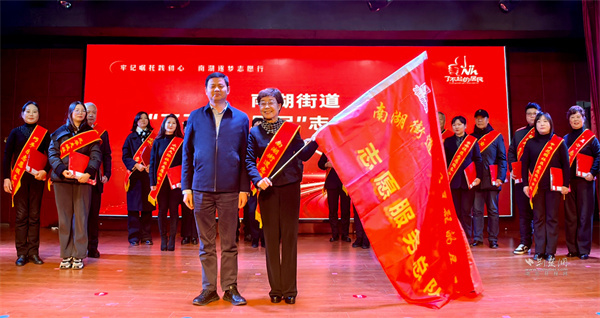 活動(dòng)的另一重頭戲,是“了不起的居民”志愿服務(wù)總隊(duì)的成立儀式。在區(qū)委社會(huì)工作部部長謝琬宣讀成立文件后,區(qū)委副書記、統(tǒng)戰(zhàn)部部長劉海停上臺(tái)為總隊(duì)隊(duì)長張淑靜授旗,標(biāo)志著南湖街道近300支活躍的志愿服務(wù)隊(duì)伍,有了統(tǒng)一的旗幟與核心。
