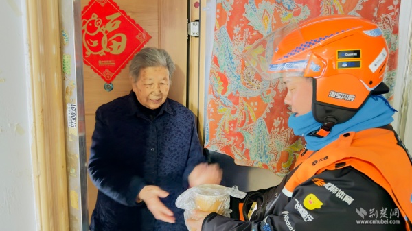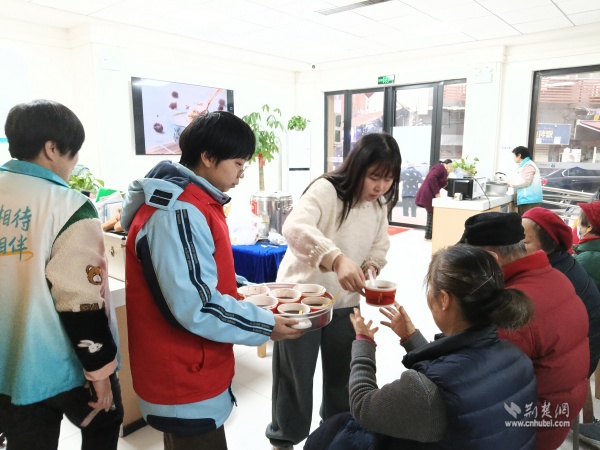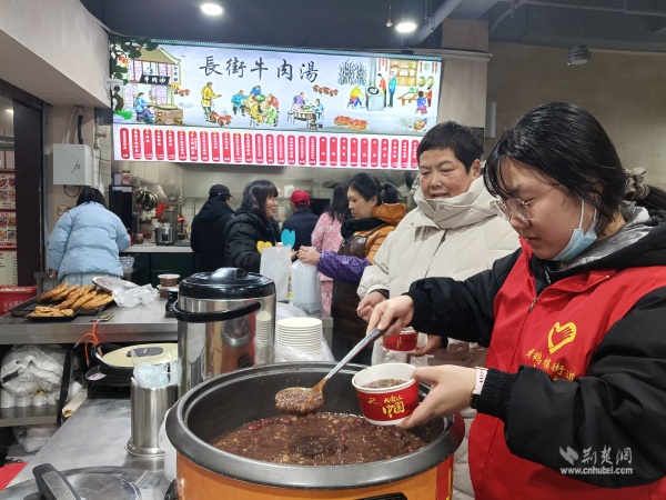 溫暖派送覆蓋多元群體。在戶外勞動者驛站,環(huán)衛(wèi)工人、快遞外賣騎手從志愿者手中接過熱粥;社區(qū)還鏈接武漢市第三醫(yī)院資源,為戶外工作者提供健康咨詢。幾位外賣騎手主動化身“公益騎手”,與黨員志愿者一同將暖心粥品送至“鶴耋安”高齡獨(dú)居老人家中。黨員志愿者還走訪了周邊商戶、殘疾人家庭及退役軍人家屬,并在社區(qū)設(shè)點(diǎn)邀請居民共享溫情。一碗粥,沿著黨員和志愿者的溫暖足跡,流入社區(qū)每個(gè)角落。
