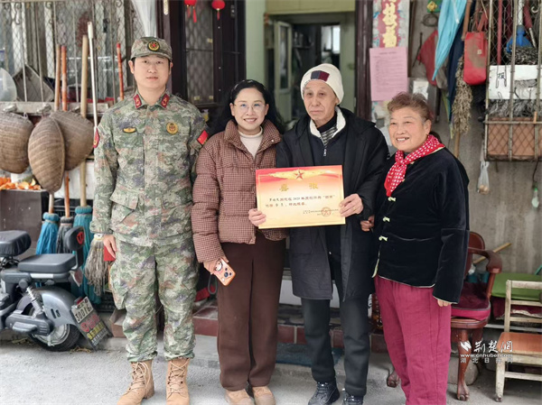 荊楚網(wǎng)(湖北日報網(wǎng))訊(通訊員 蘇楚雄 鐘霓 游薇 侯本瑞)1月29日,武昌區(qū)楊園街道電力新村社區(qū)鑼鼓聲響、熱鬧非凡。街道人武部、退役軍人服務站和社區(qū)工作人員組成“報喜小隊”為現(xiàn)役軍人家屬送去子女在部隊榮獲的“四有”優(yōu)秀學員榮譽證書,并送上慰問物資,傳遞對軍屬的崇高敬意和誠摯關懷。
