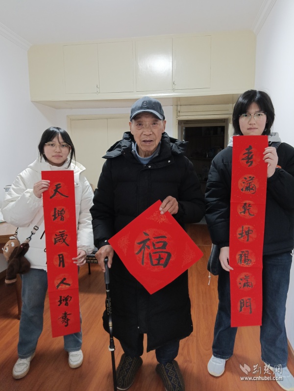 針對(duì)社區(qū)高齡、獨(dú)居老人,志愿者們開展“敲門行動(dòng)”,走進(jìn)“鶴耋安”重點(diǎn)關(guān)愛對(duì)象家中。在88歲的李奶奶家門口,志愿者們將一副寫有“福壽安康”的春聯(lián)認(rèn)真貼好,紅紙金字映亮了老人的笑臉?!澳銈円粊?,家里就熱鬧了,這春聯(lián)比買的還暖心!”李奶奶說道。每到一戶,志愿者們都送上手寫春聯(lián)與“?!弊?,幫忙排查水電隱患,陪老人聊家常、憶往昔,用陪伴驅(qū)散冬日的冷清。