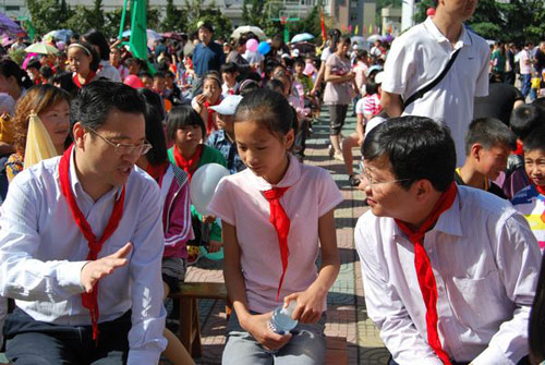 開幕式結(jié)束后,佩戴著少先隊(duì)員敬獻(xiàn)的紅領(lǐng)巾,周森鋒來(lái)到同學(xué)們中間,和大家一起唱誦國(guó)學(xué)經(jīng)典《鋤禾》、《弟子規(guī)》,觀看文藝節(jié)目,并親切地和身邊的小學(xué)生交談,詢問(wèn)他們的家庭和學(xué)習(xí)情況,并希望他們積極參加社會(huì)實(shí)踐,鍛煉強(qiáng)健身體,增長(zhǎng)才干。