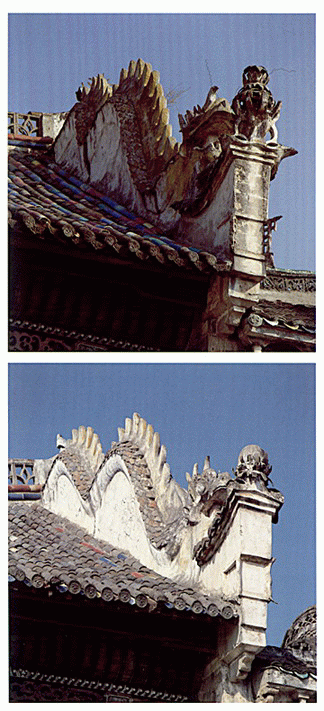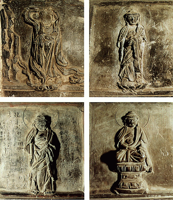 磚 雕 萬壽塔座落在荊州市荊江大堤內(nèi)側(cè)古觀音磯上,是16世紀(jì)中葉,明藩第七代遼王朱憲節(jié)遵嫡母毛太妃之命為嘉靖帝祈壽而建。塔身內(nèi)外除玉雕佛龕坐佛外,還有兩千多塊磚雕。藝人以浮雕和線刻手法塑造了神態(tài)各異的佛像、動(dòng)物、花鳥圖案。磚雕兩側(cè),還以漢、滿、蒙、藏、回五種文字刻有捐資者姓名、捐資數(shù)目。